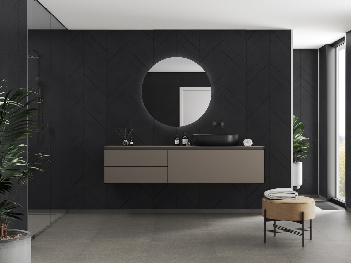 Donker, bijna zwart decor – met subtiele betonreferenties.