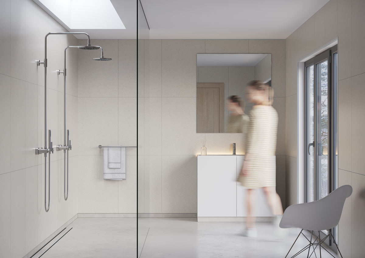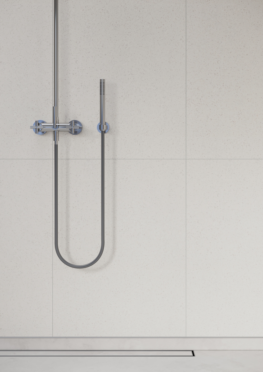 Grijze terazzolook voor een tijdloze en levendige uitstraling. Met hun unieke patroon en glanzende afwerking bieden deze panelen een uitstekende optie voor het creƫren van een moderne en stijlvolle ambiance met een vleugje speelsheid.