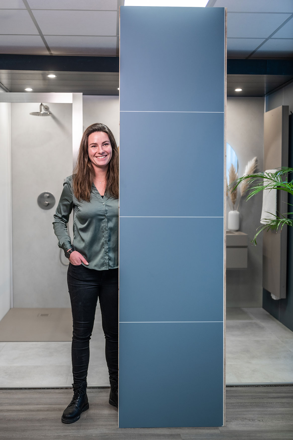 De opstart van een badkamerproject met Fibo is niet anders dan bij tegels. “Een klant of opdrachtgever komt langs in onze showroom en maakt een keuze voor wat zij het liefst op de muur willen. Wij adviseren daarin. De standaard ‘tegellook’ wordt nog vaak gekozen, maar wij willen onze klanten ook bekendmaken met de oneindige designmogelijkheden van Fibo. De meest luxe look creëren, daar gaan we uiteindelijk voor. In een 3D-tekening met sanitair erbij maken we vervolgens het hele plaatje voor de klant af!”